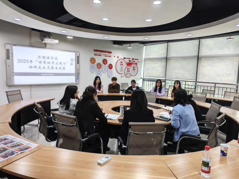 10月23日下午,重庆工商大学外国语学院研分会在涵智楼1217会议室主持了2025世界城市日中国主场活动志愿者招募面试。研分会邀请周琳院长、吴欢欢副书记、刘繁副院长、李勤老师共同担任评委,宋敏子老师负责主提问。