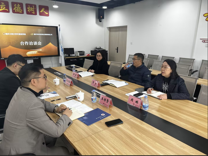 12月11日下午,外国语学院与重庆华伊贸投商业管理有限公司校企合作洽谈会在学院顺利举行。参加洽谈会的有华伊贸投公司总经理王传贤及公司助理张宗鑫,学院党委书记彭勇、院长周琳、副院长邹莉。