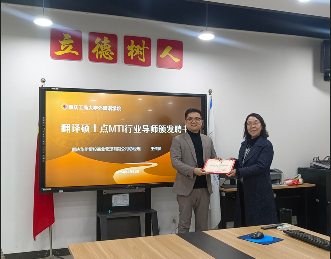 会上,学院正式聘请王传贤总经理为翻译硕士点(MTI)行业导师,并颁发聘书。