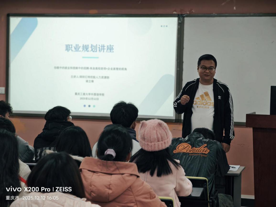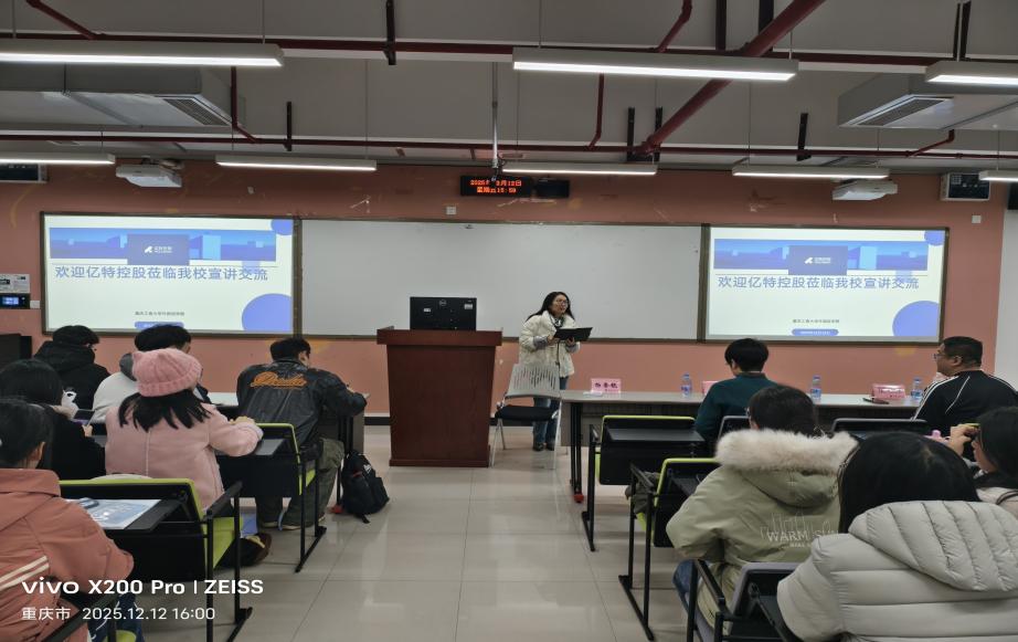 2025年12月12日,外国语学院邀请深圳亿特控股公司在12教1108开展校园招聘宣讲会暨交流会。本次活动由外国语学院学工办杨香艳老师与法语系主任周渝老师共同牵头,邀请亿特控股人力资源部部长梁立峰、人事主管张喜龙亲临现场,与在外院师生展开面对面交流。