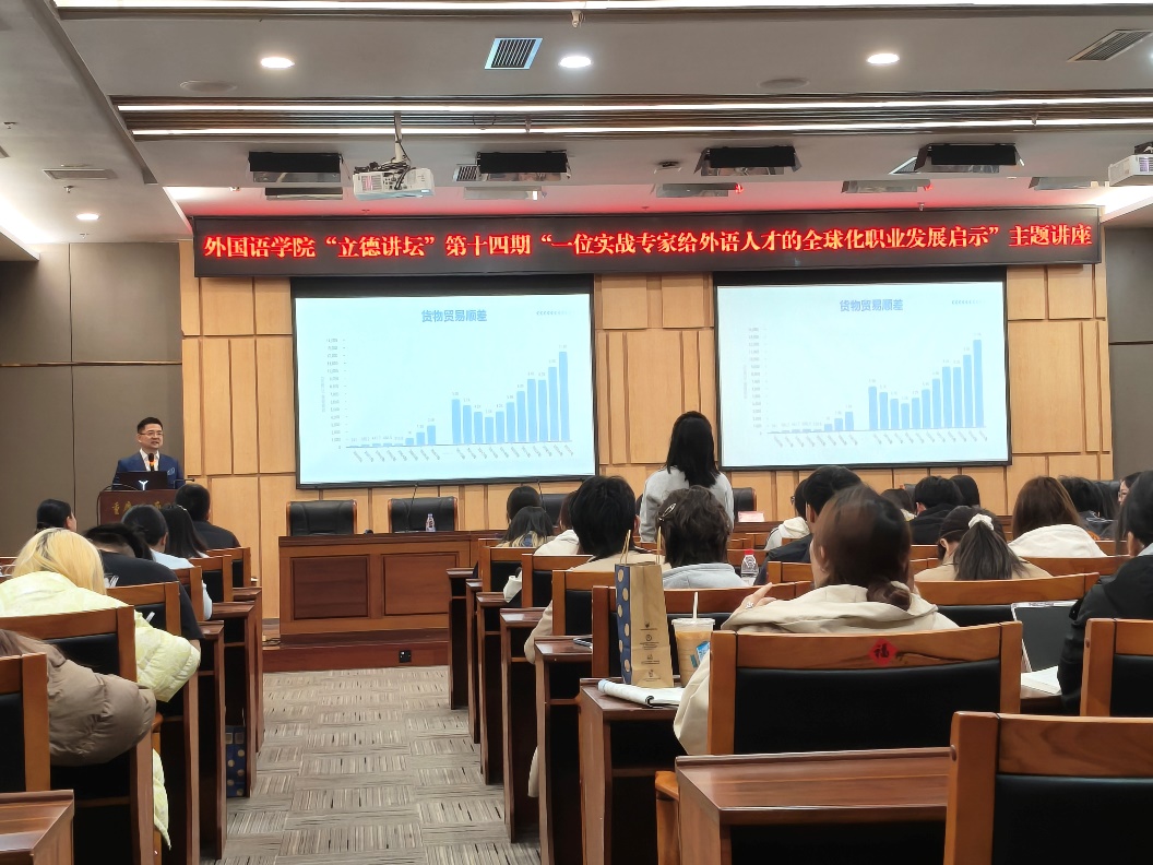 外国语学院党委副书记吴欢欢在致辞中指出,当前中国外贸正经历深刻变革,中国出口重心从传统终端消费品向中高端中间品与资本品的转型升级。“这一变革对人才需求提出了全新要求。她强调,身处这样一个充满机遇与挑战的伟大时代,无论是学习外语、钻研商务,还是未来走向国际市场、投身“一带一路”建设,都需要同学们具备开阔的国际视野、扎实的专业功底、坚定的文化自信和卓越的沟通能力,希望同学们努力成为具有新儒商精神、兼具家国情怀与国际视野的新时代人才。”